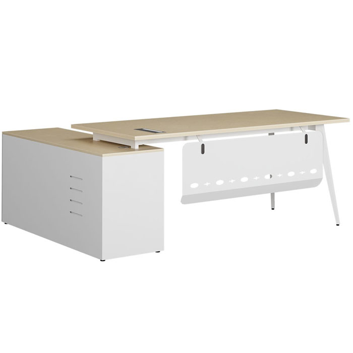 Mặt bàn sử dụng gỗ Melamine cao cấp màu M14, tạo sự tương phản hài hòa và dễ dàng kết hợp với nội thất văn phòng.
