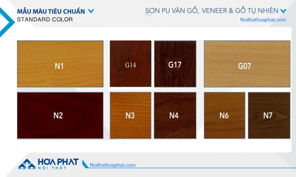 Bảng mã màu gỗ tự nhiên và gỗ Verneer dành cho những dòng sản phẩm cao cấp như bàn họp, bàn giám đốc, bàn trưởng phòng, tủ giám đốc..